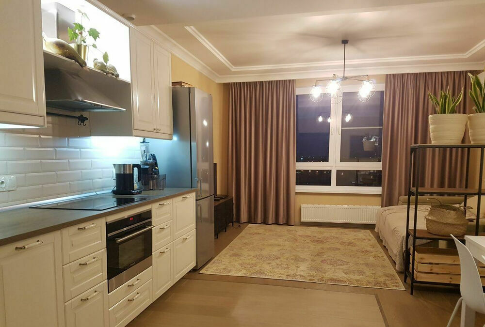 Квартира с панорамным видом, 2 отдельные комнаты на разные стороны дома (16 и 18 кв.м) + большая кухня-гостиная 27 кв, что делает ее крайне похожей на трешку.