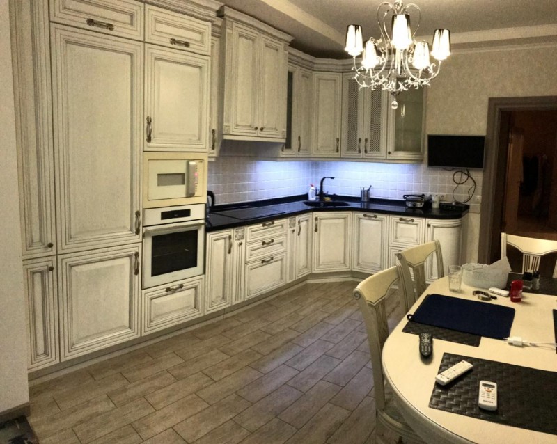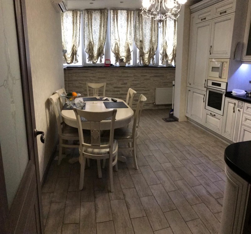 Кухня объединена с лоджией в единое пространство для увеличения площади. Установлен красивый кухонный гарнитур со множеством импортной встроенной бытовой техники.