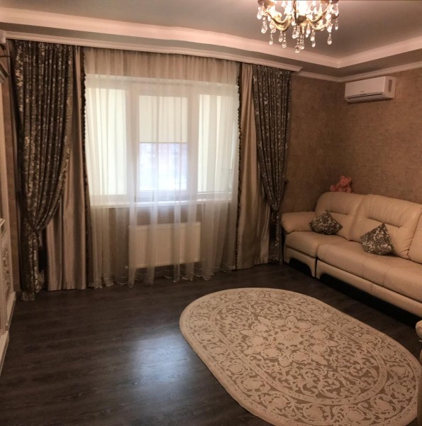 В квартире сделан качественный ремонт с использованием дорогих отделочных материалов. На полу в прихожей и кухне положена импортная керамическая плитка, в комнатах на полу постелен ламинат. Стены оклеены обоями, потолки во всей квартире сделаны двухуровневые с использованием гипсокартона и натяжных потолков. В кухне, санузле и прихожей оборудован пол с подогревом от системы отопления.