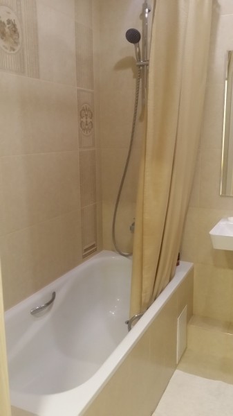 Санузел совмещенный, на полу и стенах положена керамическая плитка, установлена хорошая сантехника.
