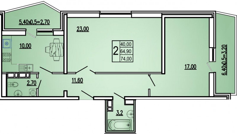 Квартира обшей площадью 74 кв.м. В ней: холл - 11,6 кв.м.; два санузла - 3,2 кв.м. и 2,7 кв.м.; жилые комнаты - 23 и 17 кв.м. с выходом на 6,4-х метровый балкон; кухня - 10 кв.м. с выходом на балкон.