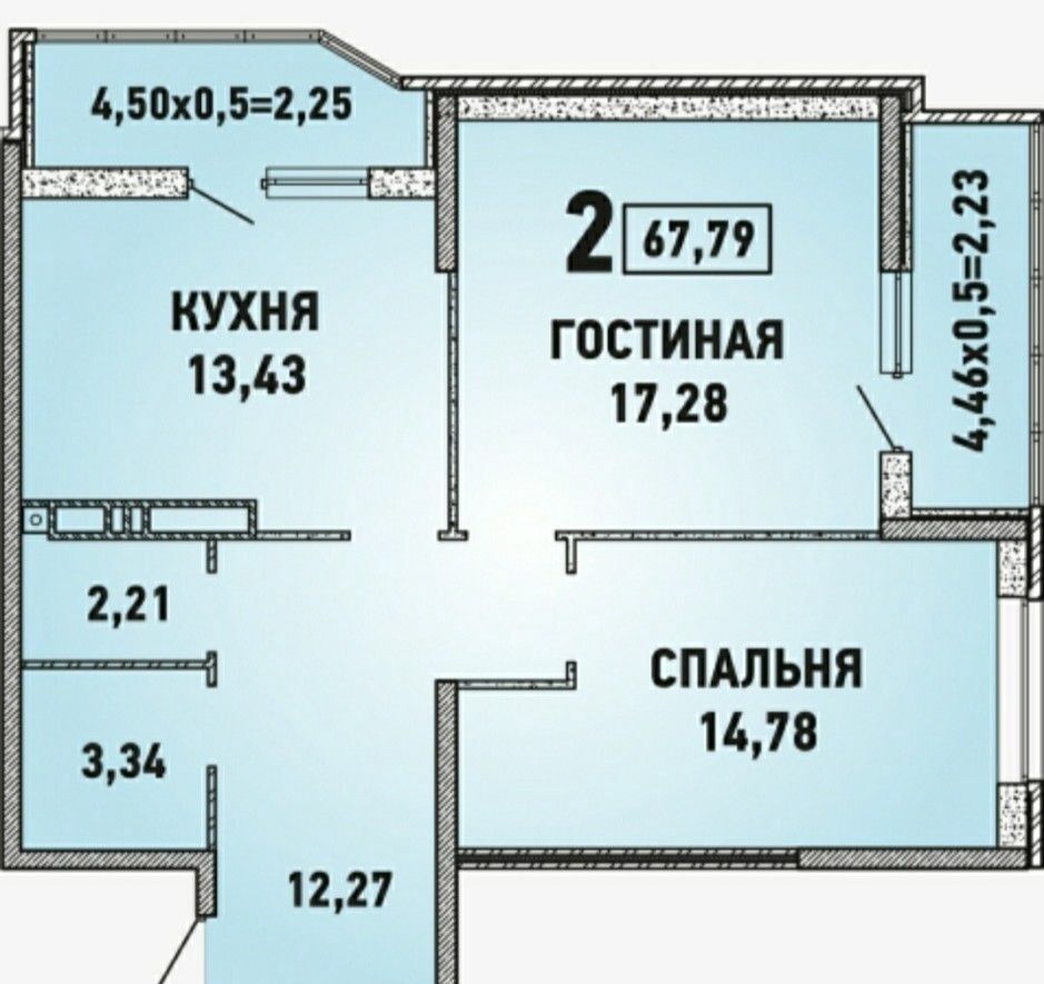 Кухня - 13,43 м.кв. + 4,50 м.кв. - лоджия из кухни (можно объединить и тем самым сделать Евро3, с большой кухней-гостиной и двумя отдельными спальнями)